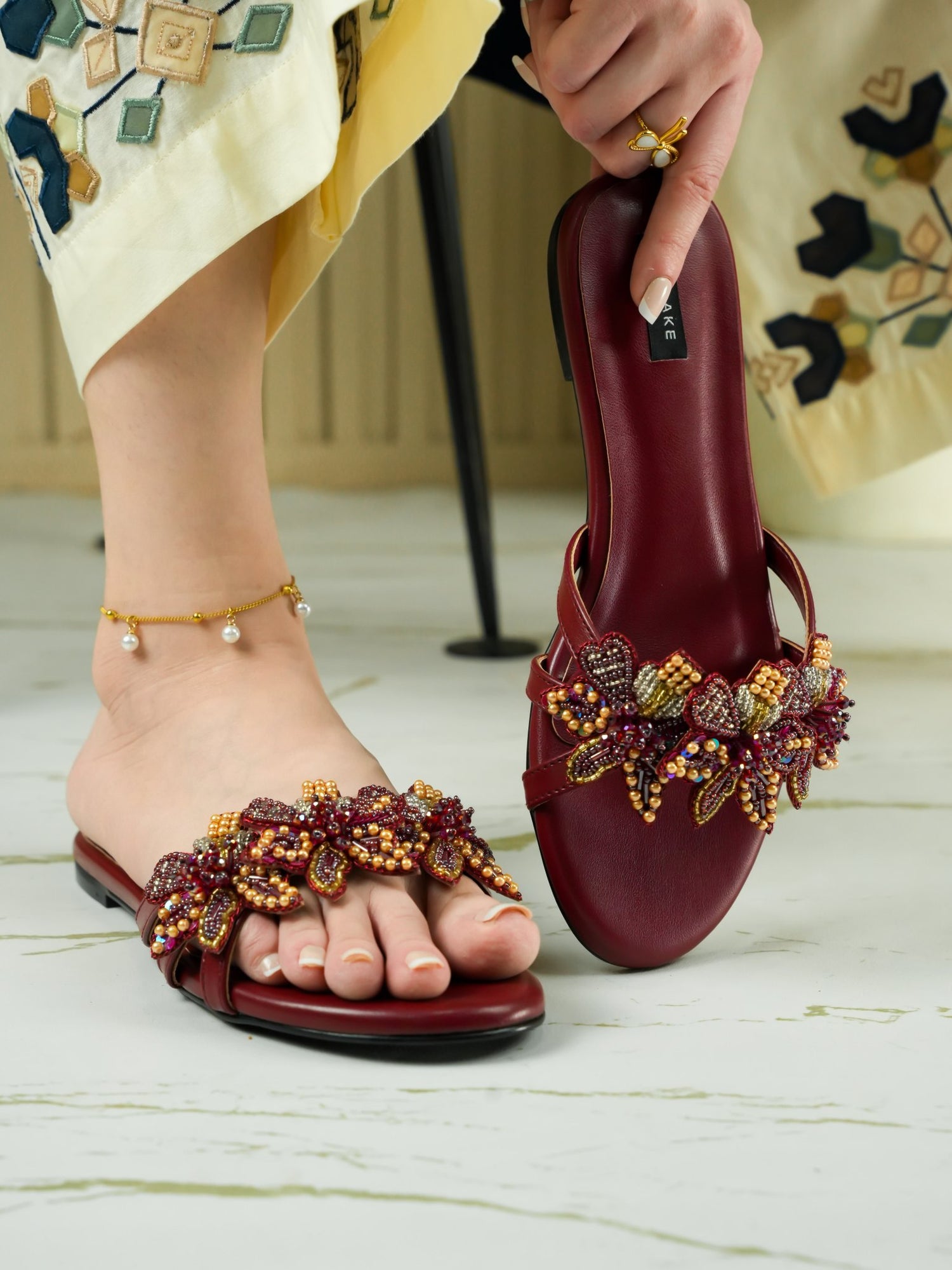 Elegant ruby slip-on sandals adorned with intricate hand-beaded floral detailing in gold and berry tones, featuring rich floral bead embellishments that bring a timeless, graceful touch to any outfit. A perfect blend of comfort and style, ideal for festive or casual wear.