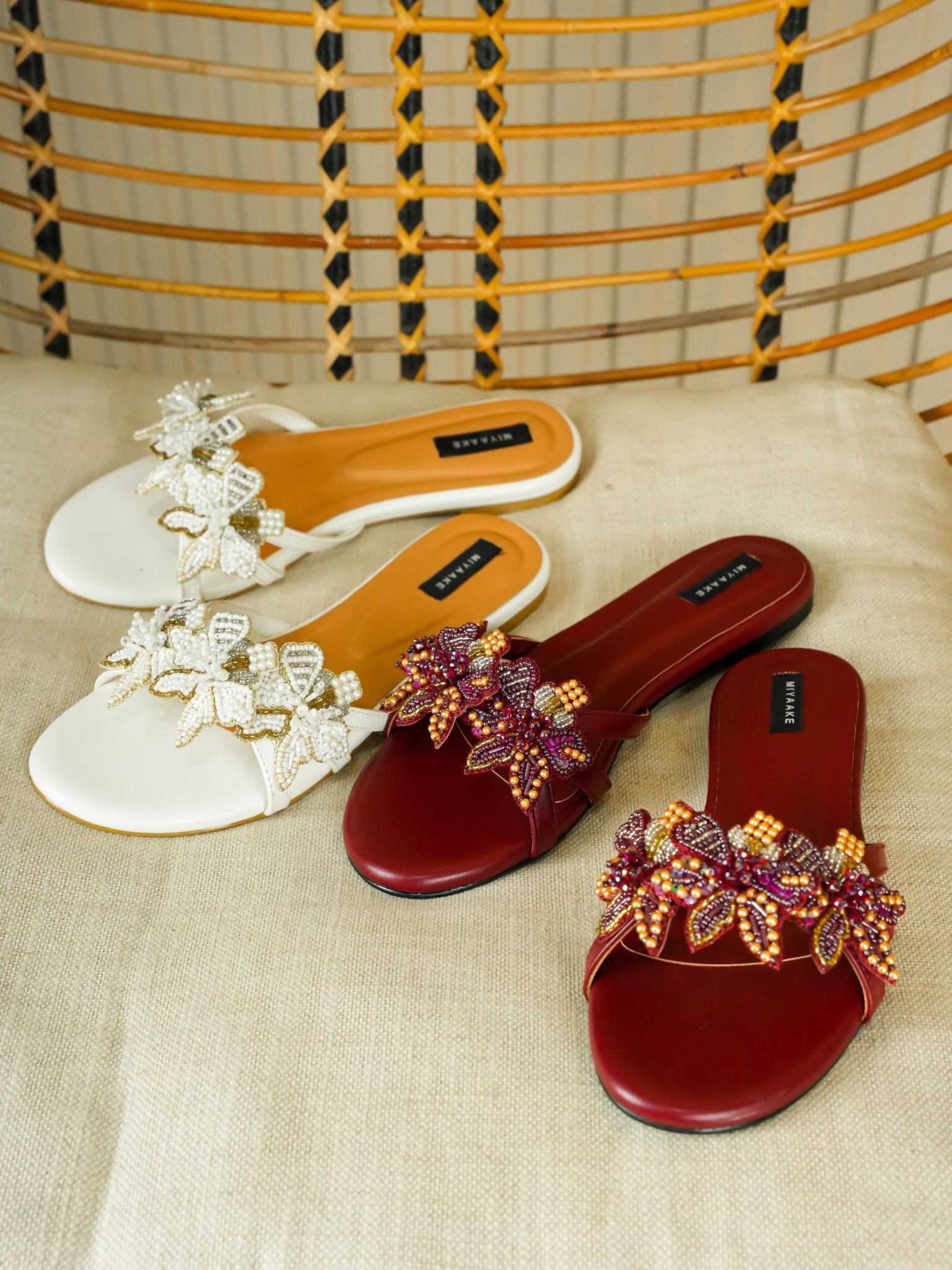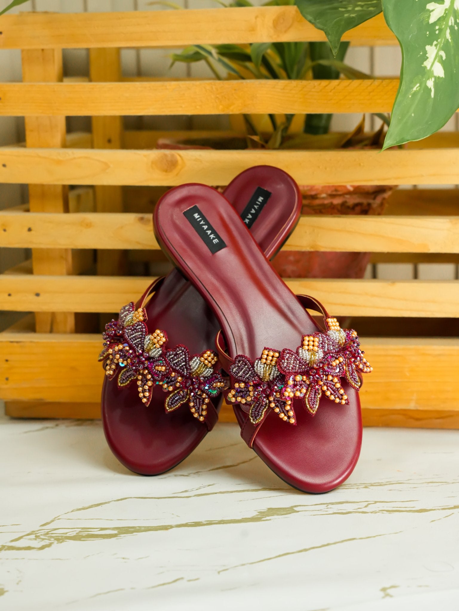 Elegant ruby slip-on sandals adorned with intricate hand-beaded floral detailing in gold and berry tones, featuring rich floral bead embellishments that bring a timeless, graceful touch to any outfit. A perfect blend of comfort and style, ideal for festive or casual wear.