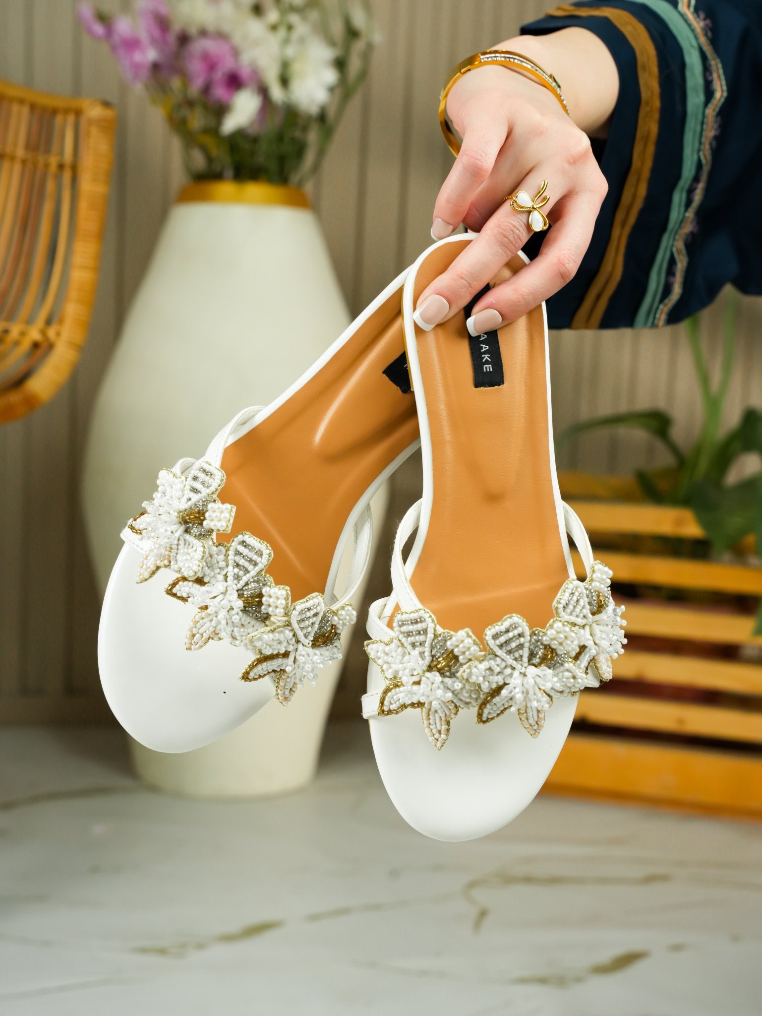 Elegant pearl slip-on sandals adorned with intricate hand-beaded floral detailing in gold and berry tones, featuring rich floral bead embellishments that bring a timeless, graceful touch to any outfit. A perfect blend of comfort and style, ideal for festive or casual wear.